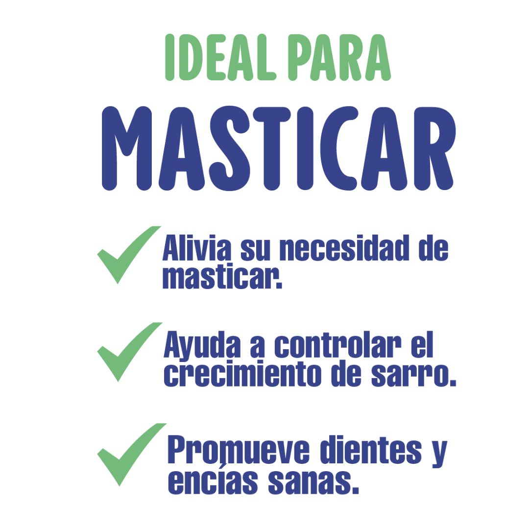 Alivia la necesidad de masticar, promueve dientes y encías sanas, ayuda a controlar el crecimiento de sarro. Indicado para el período de dentición de las mascotas. 0% carnaza. Para razas minis y pequeñas.